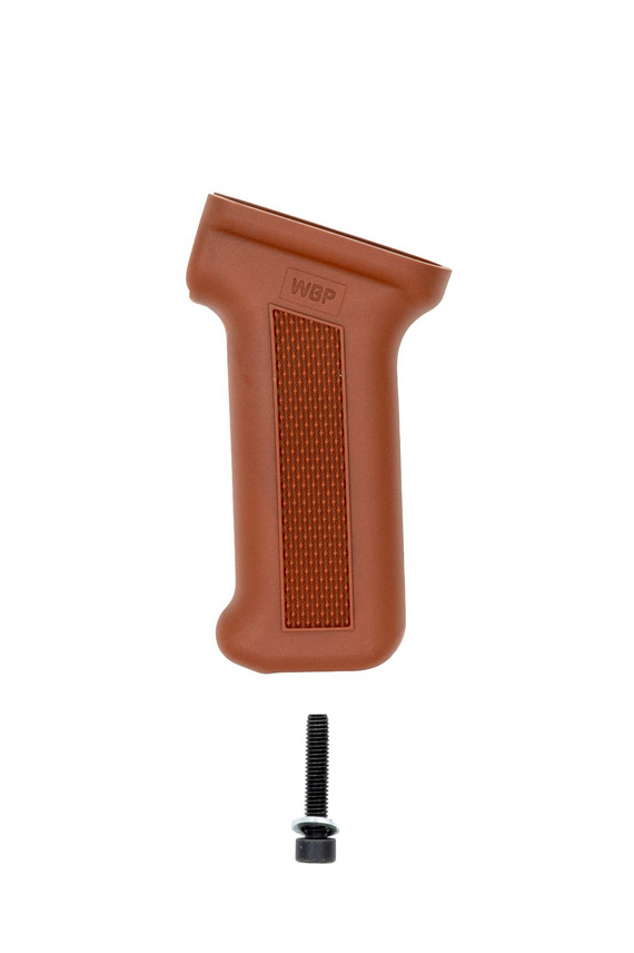 Standardowa, brązowa rękojeść polimerowa wykonana z wysokiej jakości polimeru. Produkt z bieżącej produkcji. W zestawie śruba i nakrętka. Pasuje do większości karabinków typu AK/AKM/AKMS.
